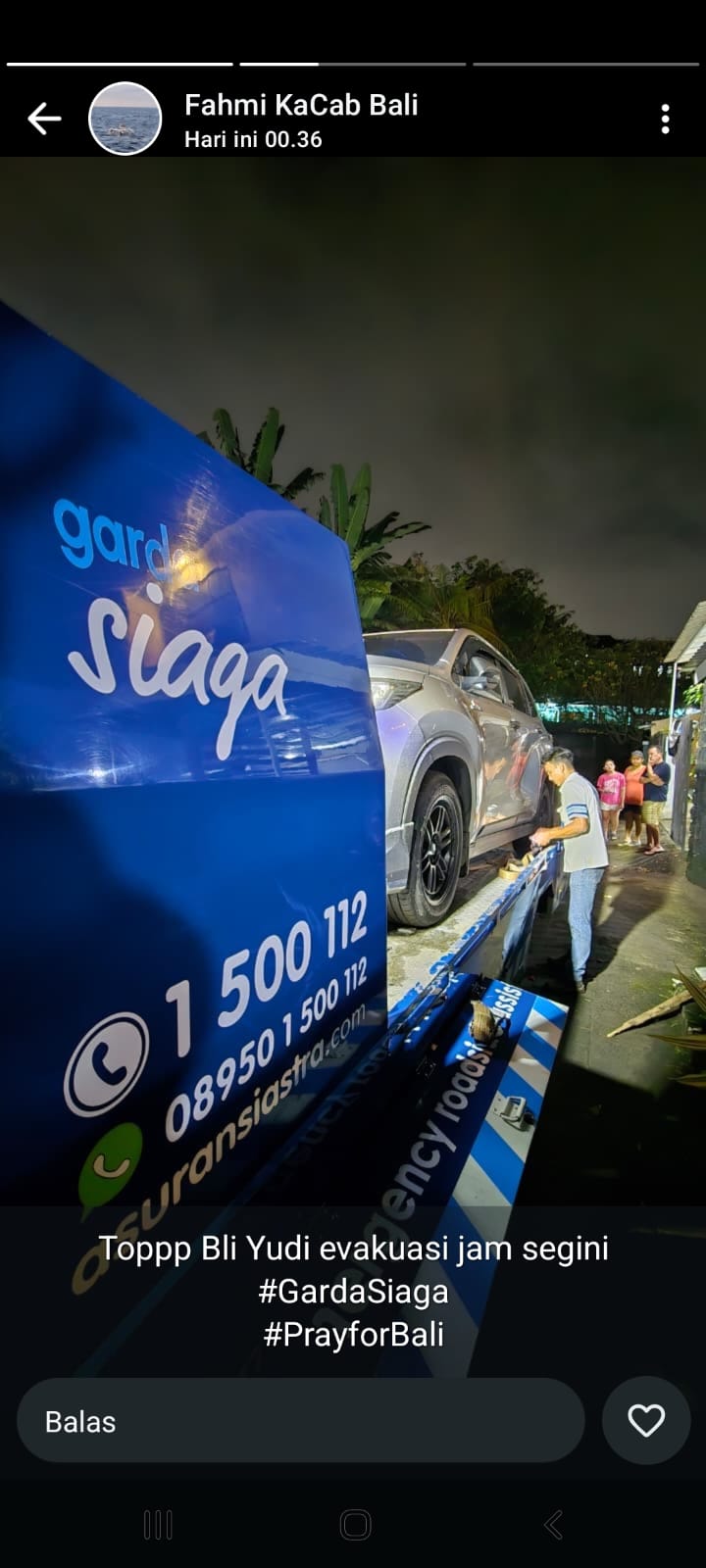 disertai tagar #GardaSiaga dan #PrayforBali, menggambarkan apresiasi terhadap kerja keras tim serta kondisi yang mungkin terjadi di Bali pada saat itu — bisa jadi karena cuaca buruk, banjir, atau kondisi jalan yang berbahaya.